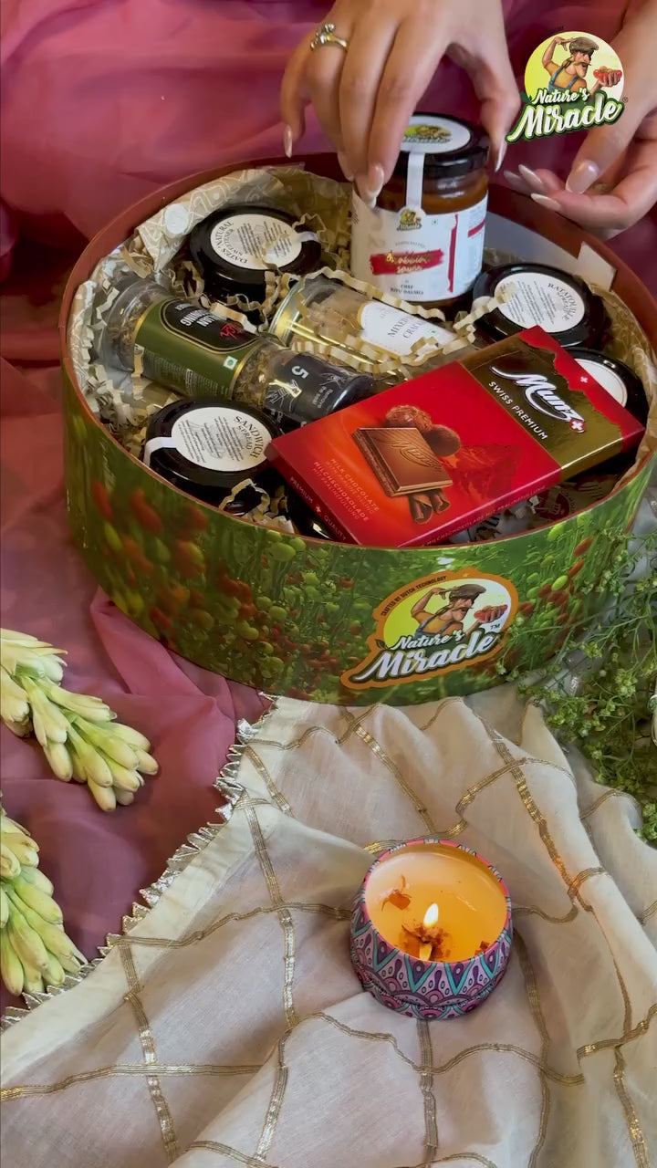 A thoughtfully curated round hamper packed with gourmet delights to elevate every occasion. This collection includes artisanal spreads, premium chocolates, seasoning blends, and Italian essentials—perfect for food lovers who appreciate fine taste.